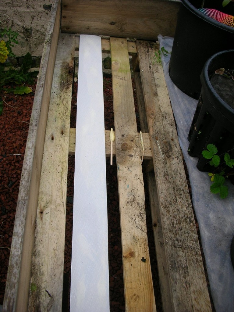 Using recycled material means you may have to be a little innovative as not all recycled items are perfect. The first pallet used in this assembly had a damaged strut on it. It’s difficult to get the nails out of pallets and since the weight would be spread over the whole pallet, I thought I might give it a little bit of reinforcement. A strip from an old vertical blind, glued onto the damage part, might help a little bit for it to bear whatever weight there would be on it.